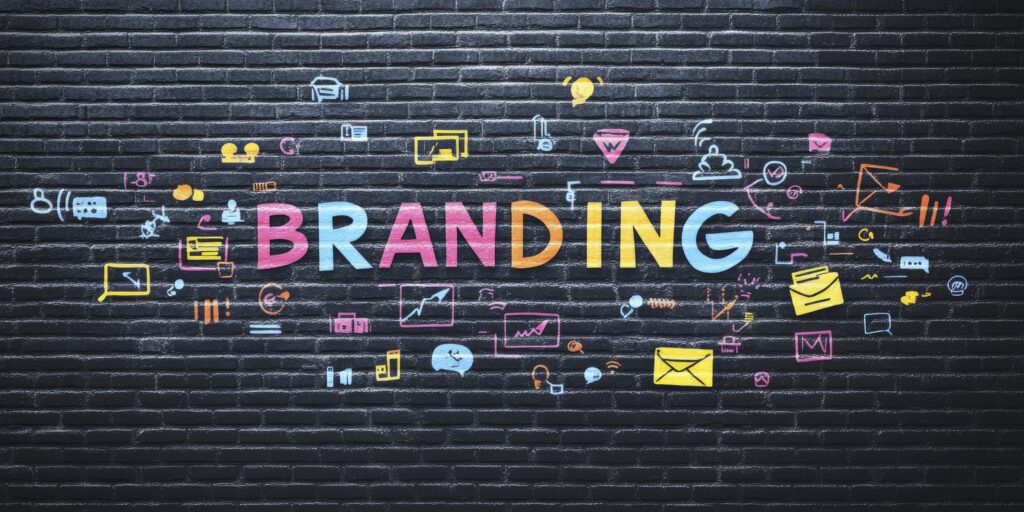 A black brick wall with the word BRANDING written in colorful letters, surrounded by digital marketing icons and symbols